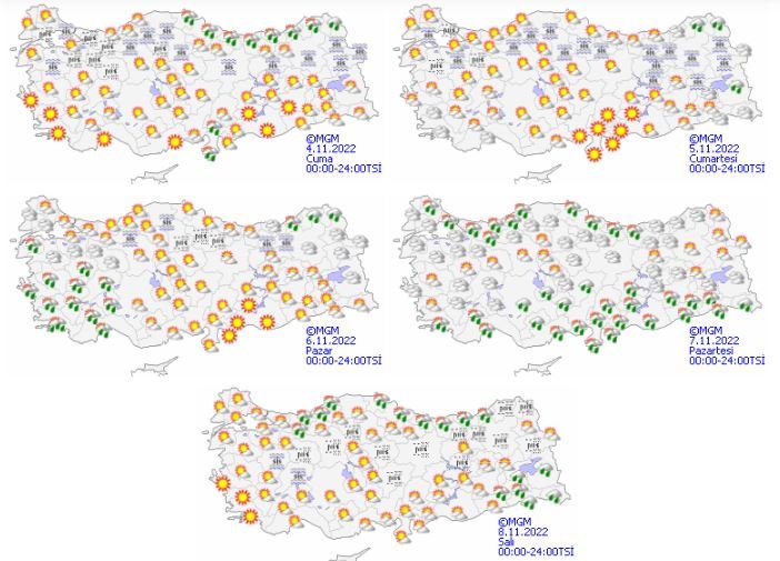 Meteoroloji Genel Müdürlüğü tarafından yapılan son değerlendirmelere göre; Ülkemizin kuzey kesimlerinin parçalı, yer yer çok bulutlu, Doğu Karadeniz kıyıları ile Osmaniye, Ordu, Artvin ve Ardahan çevreleri ile Samsun'un doğu kesimlerinin yağmur ve sağanak yağışlı, Doğu Karadeniz'in iç kesimlerinin yüksekleri ile Ardahan'ın yüksek kesimleri karla karışık yağmur ve yer yer kar yağışlı, diğer yerlerin az bulutlu ve açık geçeceği tahmin ediliyor.