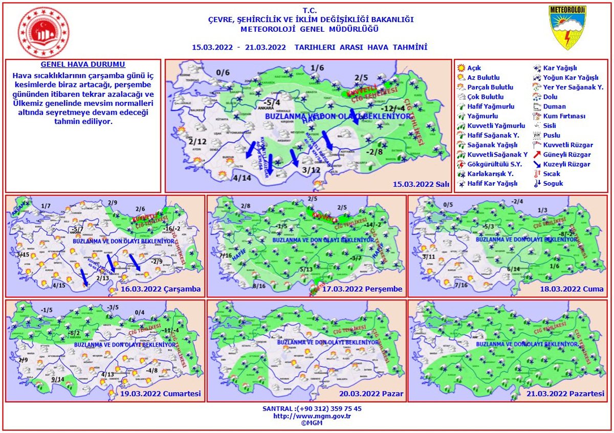 Sosyal medya hesabından da haftalık hava tahminini paylaşan Meteoroloji, mesajında "Hava sıcaklıklarının Çarşamba günü iç kesimlerde biraz artacağı, Perşembe gününden itibaren tekrar azalacağı ve ülkemiz genelinde mevsim normalleri altında seyretmeye devam edeceği tahmin ediliyor" ifadelerini kullandı.