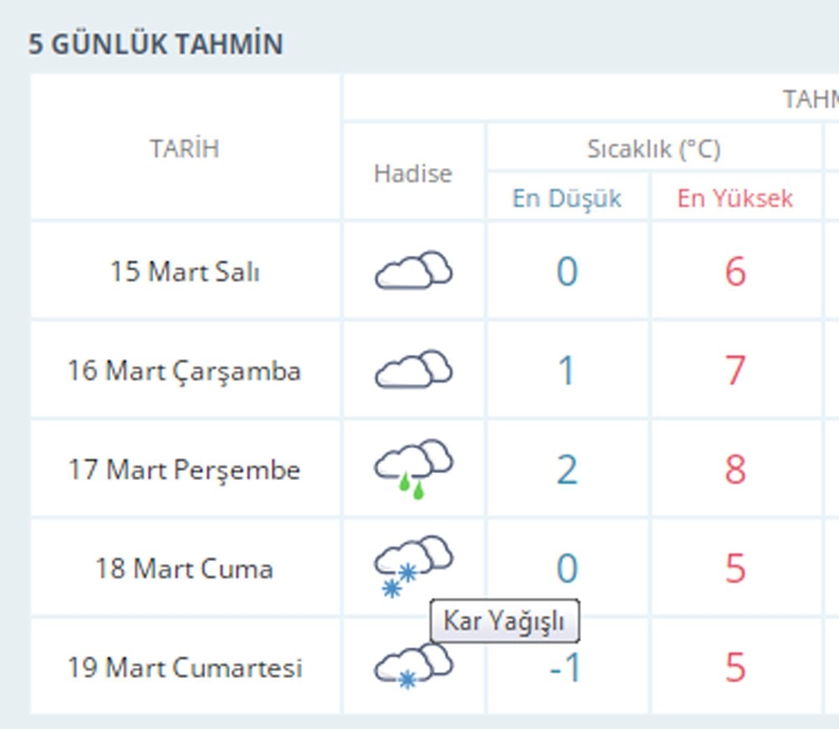 MGM'nin hava tahminlerine göre, İstanbul'da hava sıcaklığı cuma günü en düşük sıfır, en yüksek 5; cumartesi günü ise en düşük sıfırın altında 1, en yüksek 5 derece olacak.