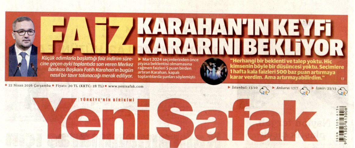 Ekonomi yönetimine bir süredir ‘savaş’ açan Yeni Şafak, 20 Nisan’daki manşetinde ‘Şimşek’in ekonomi programının çöktüğünü’ yazmasının ardından bu kez bugün açıklanacak faiz kararı için "Faiz, Karahan'ın keyfi kararını bekliyor" dedi.