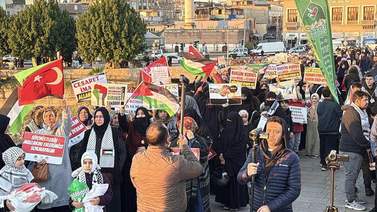 Bazı sivil toplum kuruluşları öncülüğünde Taş Köprü'de toplanan grup, İsrail'in Filistin'deki saldırılarına tepki gösterdi.
