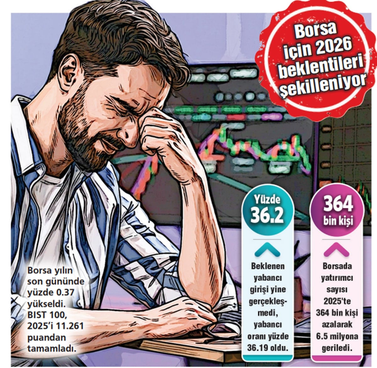 2025’te TL’nin dolar karşısındaki değer kaybı yüzde 17.7 olurken, enflasyon ise yüzde 31 seviyesinde bulunuyor. BIST 100 endeksi, geçen yıl TL bazında yüzde 14 yükselirken, dolar bazında ise yaklaşık yüzde 7 kaybettirdi. 2025’te en büyük yükseliş yüzde 392’lik getiriyle finansal kiralama ve faktöring endeksinde görüldü. Endeksteki zayıf performans nedeniyle borsada yatırımcı sayısı 364 bin kişi azalarak 6.5 milyona indi. Yabancı oranı ise 1 yılda yüzde 36.99’dan yüzde 36.19’a geriledi.