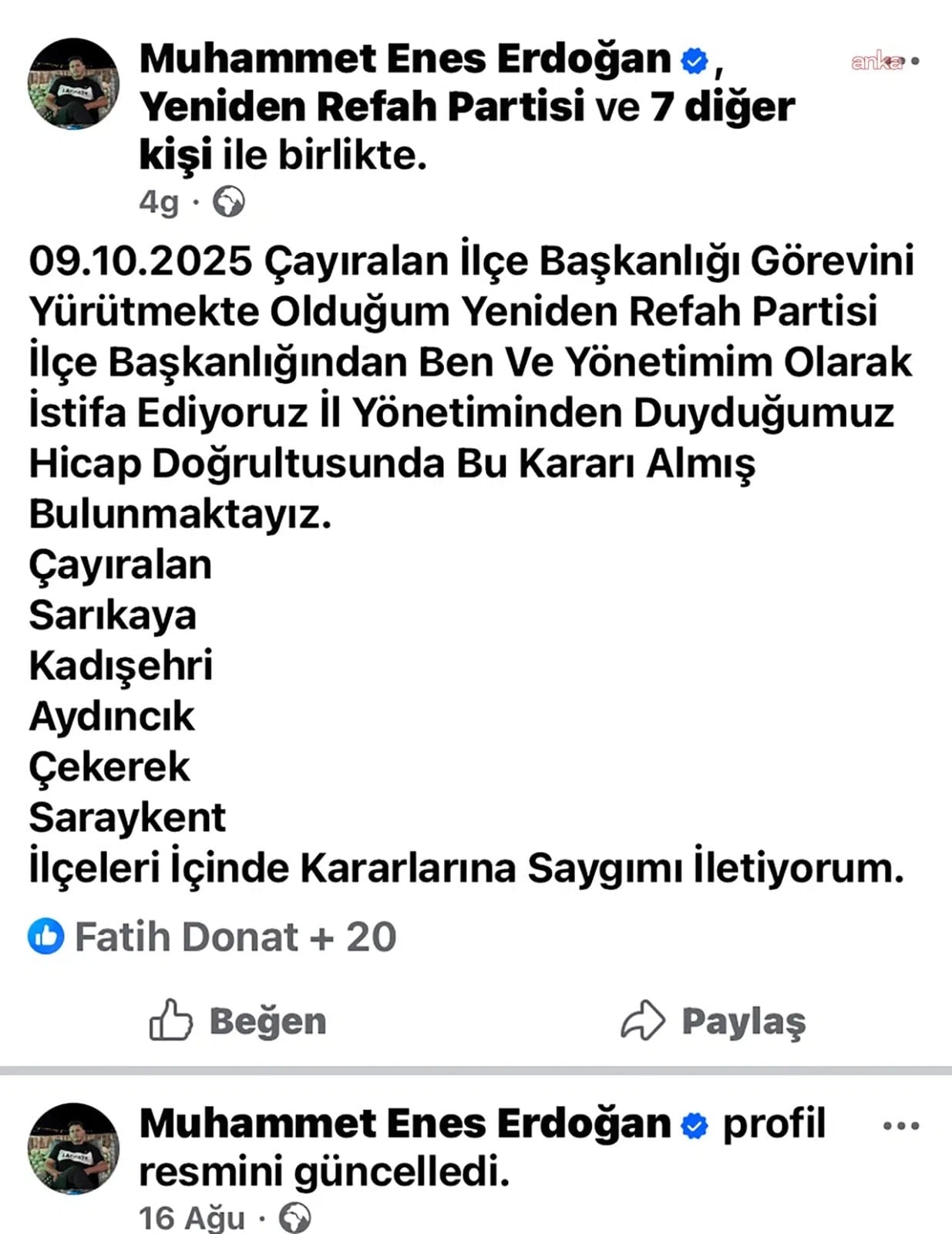 Çayıralan İlçe Başkanı Erdoğan da sosyal medya hesabından yaptığı paylaşımda, istifa kararını duyurarak, "İl Yönetiminden duyduğumuz hicap doğrultusunda bu kararı almış bulunmaktayız" ifadesini kullandı.