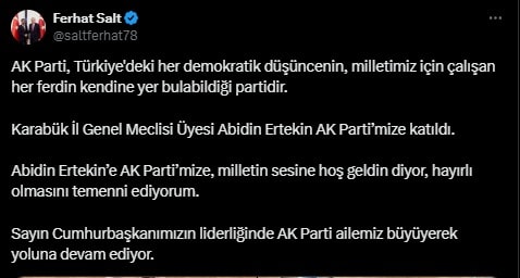 Abidin Ertekin ise, “AK Parti, ülkemizin kalkınması ve milletimizin refahı için gece gündüz çalışan bir hareket. Bu davanın bir parçası olmaktan gurur duyuyorum. Karabük ve ülkemiz için en iyi şekilde çalışmaya devam edeceğim” ifadelerini kullandı.
