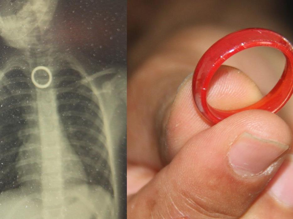 "Bu hastamız akşam saatlerinde boğazına yabancı cisim yutma yakınmasıyla ailesi tarafından hastanemize getirildi. Yaptığımız incelemeler neticesinde özellikle yemek borusunun birinci darlık kısmında yüzüğü benzer bir yabancı cisim gördük.