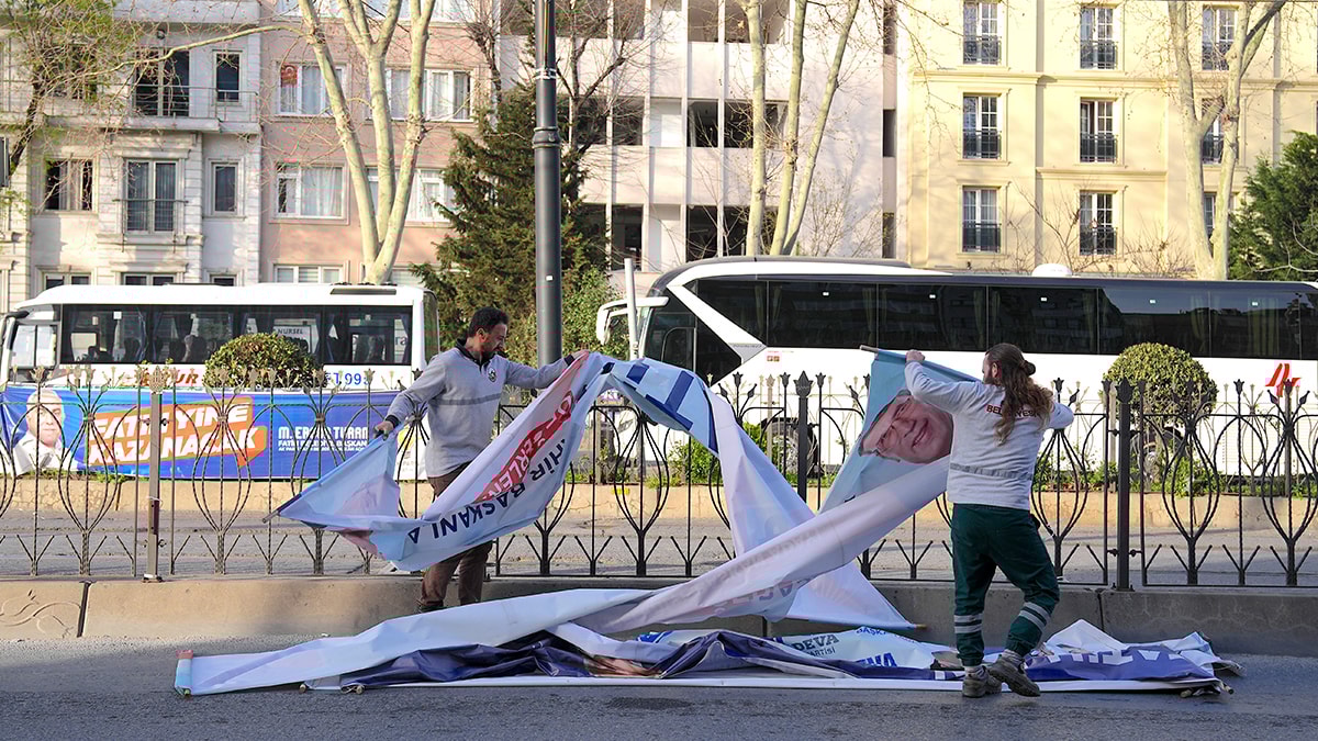 Mahalli İdareler Genel Seçimleri ile ilgili siyasi propaganda serbestliğinin sona ermesinin ardından siyasi partilerin pankart ve flamaları belediye ekiplerince toplanmaya başlandı.