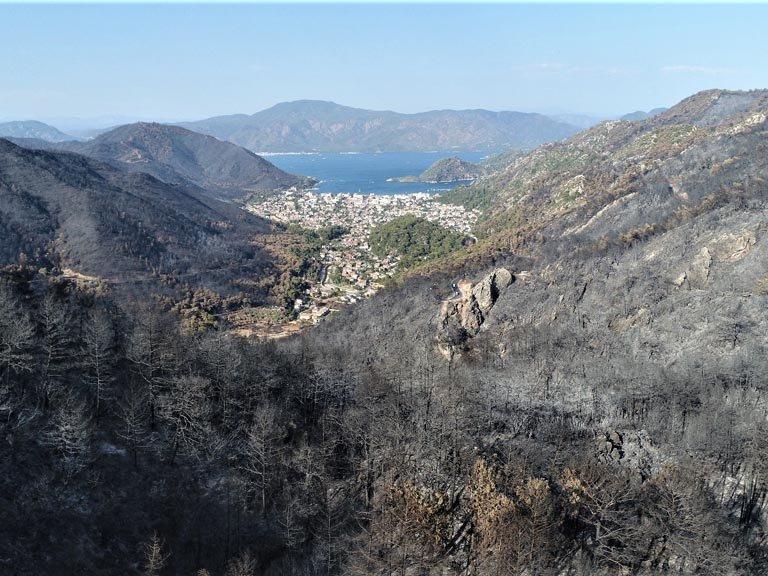 Mavi Tur’un önemli uğrak merkezlerinden birisi olan Marmaris Körfezi'ne girenleri artık yeşil değil kararmış dağlar karşılıyor. Yeşiliyle ünlü Marmaris’te bu deyim artık sona erdi. Özellikle de İçmeler’den Turunç’a gidilen karayolunda çam ağaçlarından gökyüzünün görünmediği o yoldan eser yok şimdi. Hava görüntü ve fotoğrafları içler acısı durumu açıklığıyla ortaya koyuyor. İlk tespitlere göre Marmaris’te 13 bin 600 hektar alanda ormanın yandığı belirtiliyor. Yangın sonrasındaki ölçümlerde gerçek durum ortaya çıkacak. Çünkü Marmaris yangınları kontrol altına alındıktan sonra Milas ve Köyceğiz ormanları günlerce yanmayı sürdürdü.