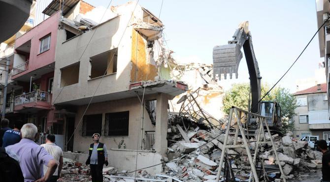 Tufan HAMARAT/İZMİR, (DHA) İZMİR'in Karabağlar İlçesi'nde dört katlı binanın yıkımı sırasında son katındaki tuğla duvarın bir kısmı, elektrik tellerine de zarar vererek çöktü. Şans eseri ölen ya da yaralananın olmadığı olayda bazı evlerde elektronik eşyaların zarar gördüğü belirtildi.