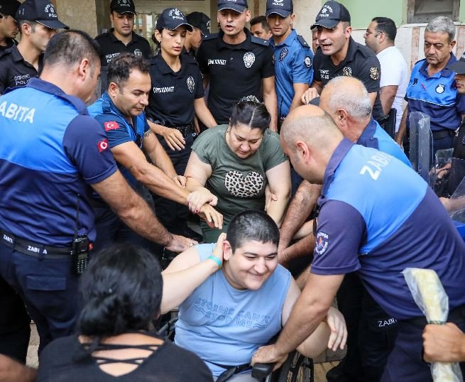 Bina giriş kapısında tekerlekli sandalyede oturan bir çocuk ise annesinin tüm engelleme girişimlerine rağmen sandalyesi kaldırılarak giriş kapısından uzaklaştırıldı. Yapılan tüm görüşme ve engelleme girişimleri sonuçsuz kalınca belediye yetkilileri, polis eşliğinde binaya girerek işleme başladı.