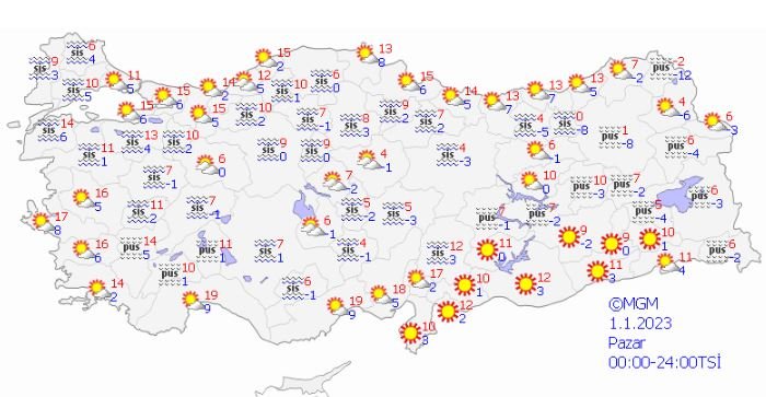 1 Ocak'ta da hava sıcaklıklarında önemli bir değişim ya da yağış beklenmiyor. Akdeniz sahillerinde hava sıcaklıkları 20 dereceye ulaşacak, yılın ilk günlerinde kış mevsiminden uzak günler yaşanacak.