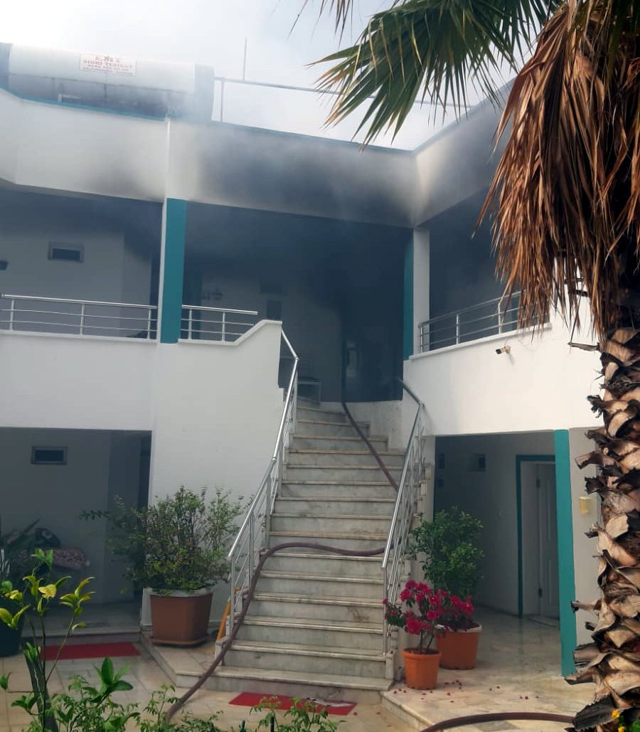 Oldukça büyük olan palmiye ağacı ile trafonun patlayarak yanmasının ardından alevler yanındaki otele sıçradı. Otelin iki odası yandı. Turistler korku dolu gözlerle otelden dışarı fırladı. Olay yerine gelen jandarma ekipleri güvenlik önlemi alırken, cadde trafiğe kapatıldı. Bölgeye sevk edilen 5 itfaiye aracı yangını kontrol altına aldı.