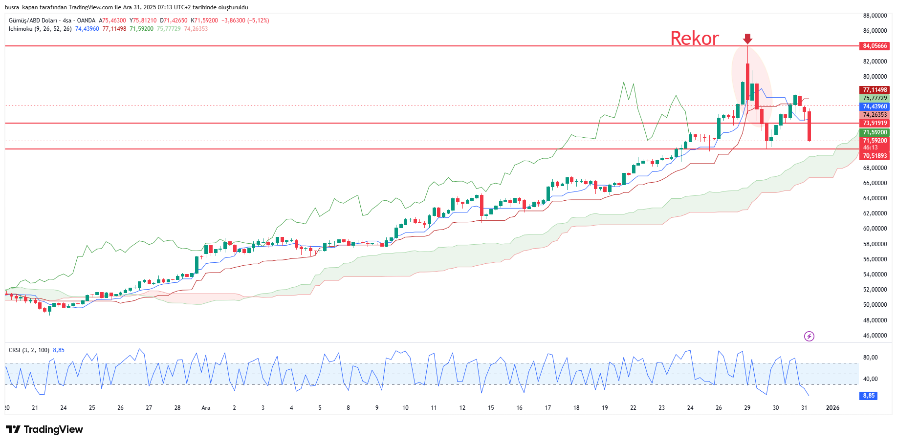 Haftaya yükselişle başlayan ons gümüş 84,05 dolara yükselerek tüm zamanların rekorunu gördü. Ancak bu yükseliş kalıcı olmadı. Ons gümüş aşağı yönlü eğilimlerini derinleştirerek bu düşüşü yeni güne gününe taşıdı. Gümüşün onsu, yılın son işlem gününde sabah seansında 08.06'da 71,60 dolarda bulunuyor.