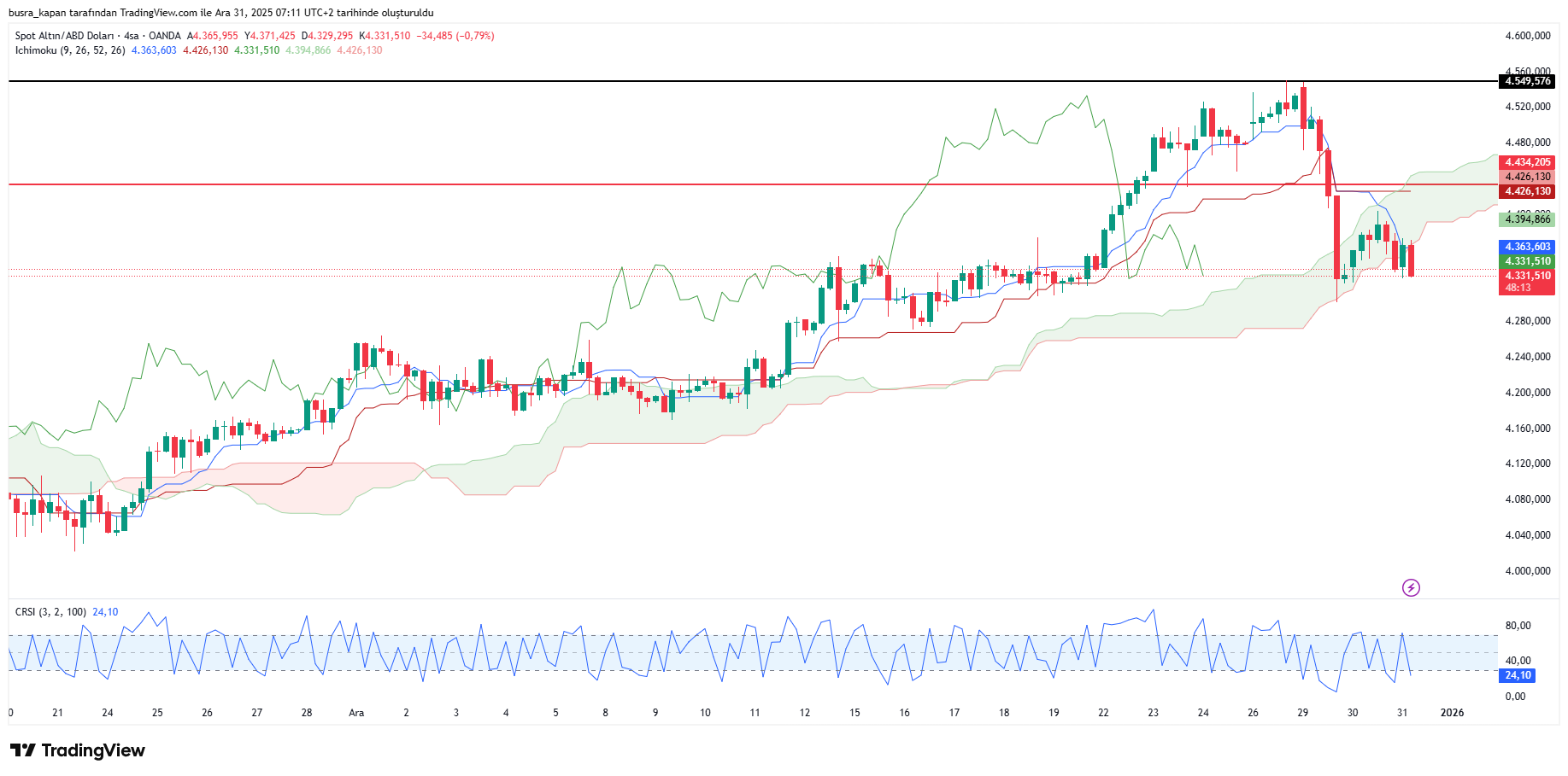 Altın fiyatları yılın son işlem gününe sert düşüşle başladı. Ons altın hafta başına 4 bin 549 dolardan başladıktan sonra bu bölgede uzun süre kalıcı olamadı. Altının onsu bugün sabah seansında 08.06'da 4 bin 332 dolarda bulunuyor.