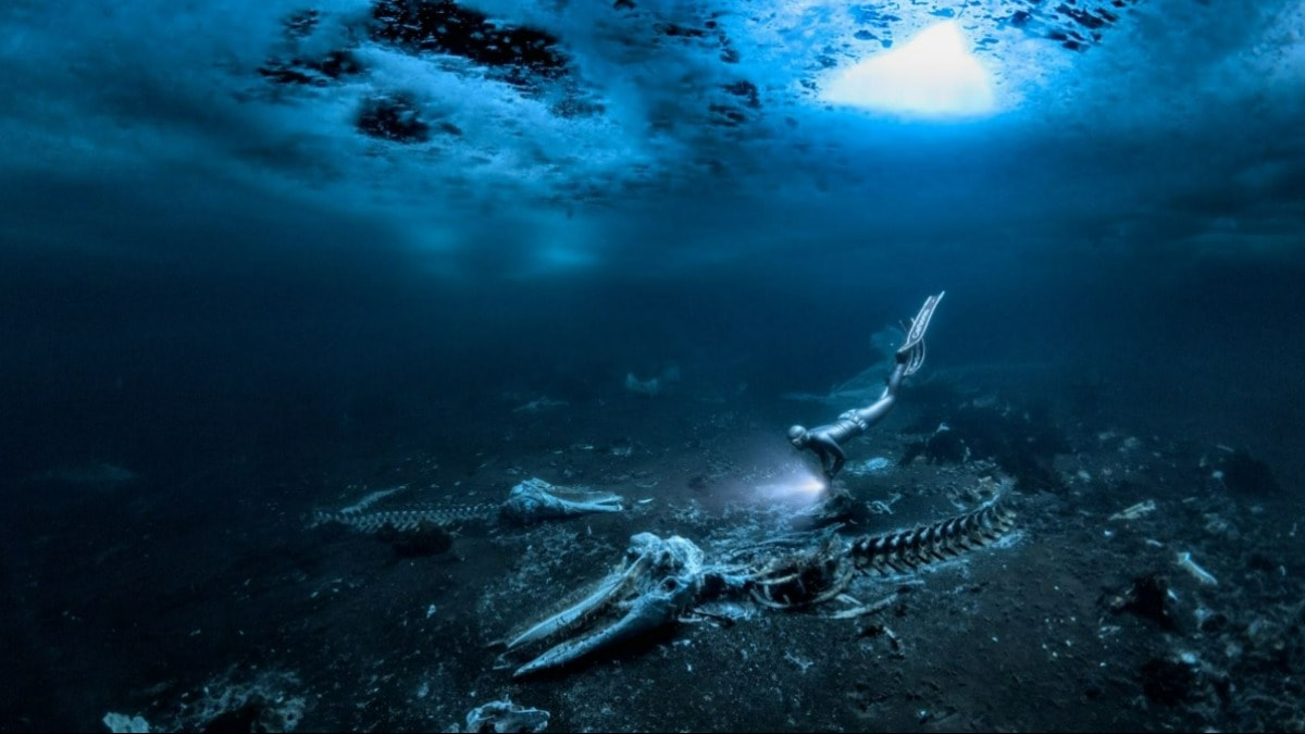 Jüri heyeti başkanı Alex Mustard, "Whale Bones, nefesini tutan bir dalgıcın leşlere tanıklık etmek için Grönland buz tabakasının altına inmesi sırasında zorlu koşullarda fotoğraflandı."