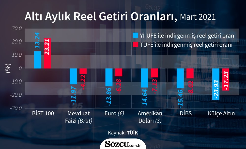 Altı aylık değerlendirmeye göre BIST 100 endeksi; Yİ-ÜFE ile indirgendiğinde yüzde 13,24, TÜFE ile indirgendiğinde ise yüzde 23,21 oranında yatırımcısına en yüksek kazancı sağlayan yatırım aracı oldu. Aynı dönemde külçe altın, Yİ-ÜFE ile indirgendiğinde yüzde 23,93, TÜFE ile indirgendiğinde ise yüzde 17,23 oranında yatırımcısına en çok kaybettiren yatırım aracı oldu.