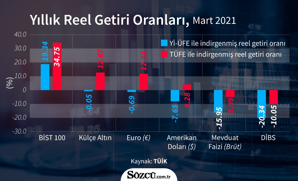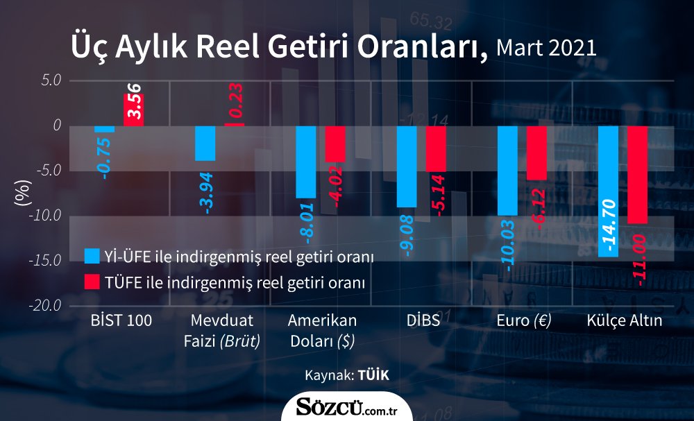 Yİ-ÜFE ile indirgendiğinde; yatırım araçlarından euro yüzde 2,40 oranında kazandırırken; külçe altın yüzde 1,29, mevduat faizi (brüt) yüzde 2,78, BIST 100 endeksi yüzde 6,26 ve Devlet İç Borçlanma Senetleri (DİBS) yüzde 7,26 oranlarında yatırımcısına kaybettirdi. TÜFE ile indirgendiğinde euro yüzde 5,49, külçe altın yüzde 1,69 ve mevduat faizi (brüt) yüzde 0,16 oranlarında kazandırırken; BIST 100 endeksi yüzde 3,43 ve DİBS yüzde 4,46 oranlarında yatırımcısına kaybettirdi.