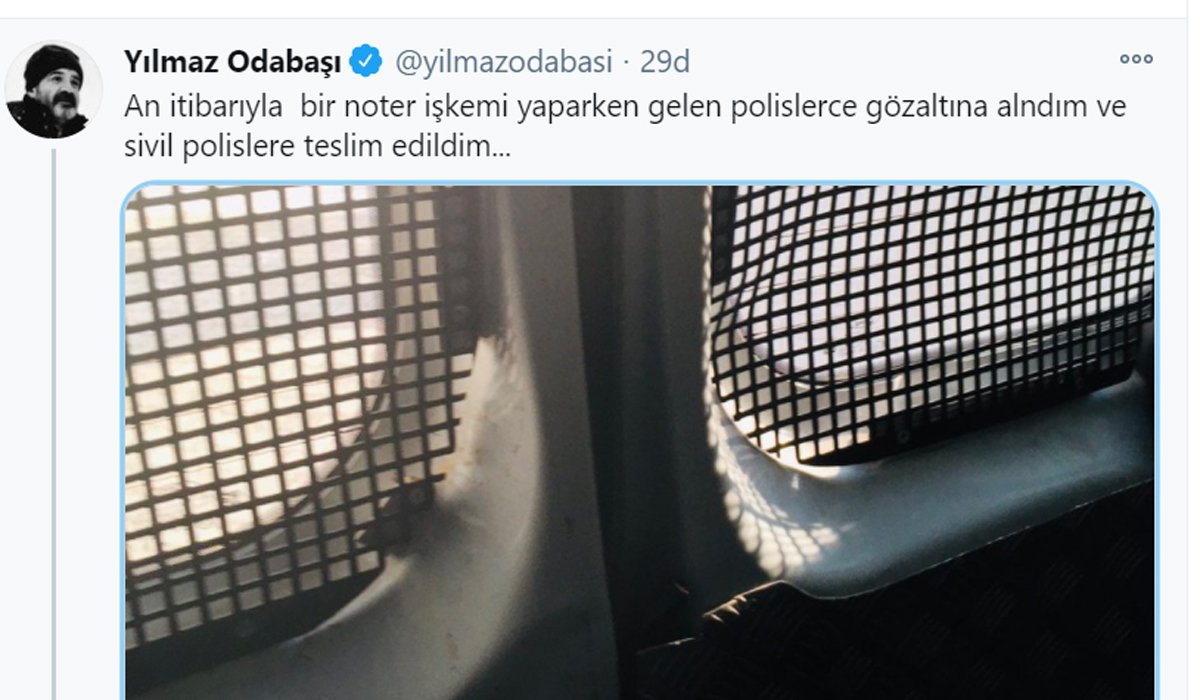 Şair Yılmaz Odabaşı twitter hesabından gözaltına alındığını duyurdu. Odabaşı, noter işlemi yaparken gelen polisler tarafından gözaltına alınıp sivil polislere teslim edildiğini ve adliyeye götürüldüğünü söyledi.