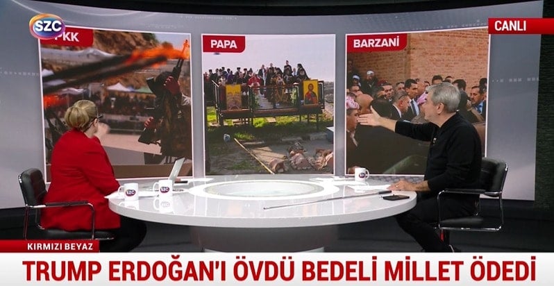 "- Bunları alkışladılar kardeşim. Suriye fatihi diye alkışladılar. Bugün Türkiye diyor ki Kobani'deki SDG'yi atacağız. Kobani'deki kardeşlerimi alnından öpüyorum diyen AKP'nin Başbakanı değil miydi? Barzani'nin Kürdistan Silahlı Kuvvetleri başka gün yok gibi 29 Ekim'de Türkiye'den resmi geçit yapıp Kobani'ye gitmedi mi? Siz şimdi hangi Suriye'yi fethediyorsunuz. Türkiye'nin başına felaketi aştılar bugün ABD sayesinde bundan döndük bunu fetih diye anlatıyorlar. Elinde çubuk tutanlarla milleti felakete götürdüler. Bugün emekliler 20 Bin lira maaşla sefil oluyor. Bu sahtekar medya yüzünden oldu. Sadece yandaş değil muhalif denen sahtekar medya. Bugün Ekrem İmamoğlu hapisteyse bunlar yüzünden hapiste. Bugün CHP hakkında kapatma davası varsa bunların yüzünden. Hala utanmadan SÖZCÜ TV AKP'nin diyorlar. AKP'nin Köpeği sizsiniz. Bunları da para vererek yaptırıyorlar. Gün gelecek bunları da göstereceğiz.