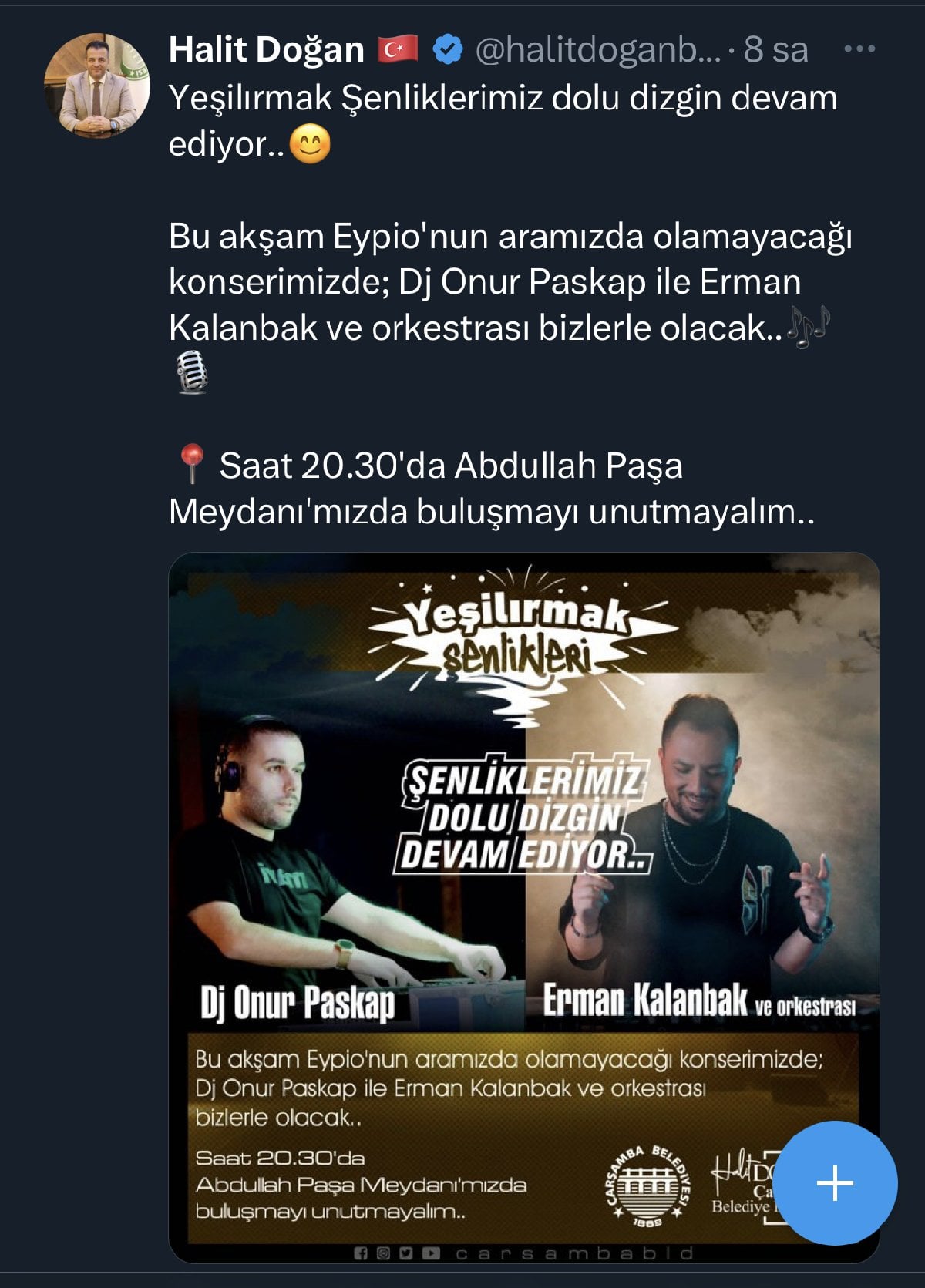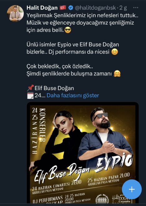 İlçenin AKP'li Belediye Başkanı Halit Doğan da sosyal medya hesabı üzerinden 25 Haziran'da ünlü rapçi Eypio'yunun sahne alacağını iki gün önceden hatırlatarak, "Yeşilırmak Şenliklerimiz için nefesleri tuttuk. Müzik ve eğlenceye doyacağımız şenliğimiz için adres belli. Ünlü isimler Eypio ve Elif Buse Doğan bizlerle... Dj performansı da nicesi. Çok bekledik, çok özledik. Şimdi şenliklerde buluşma zamanı" diyerek duyurdu.