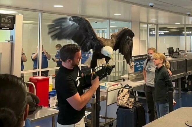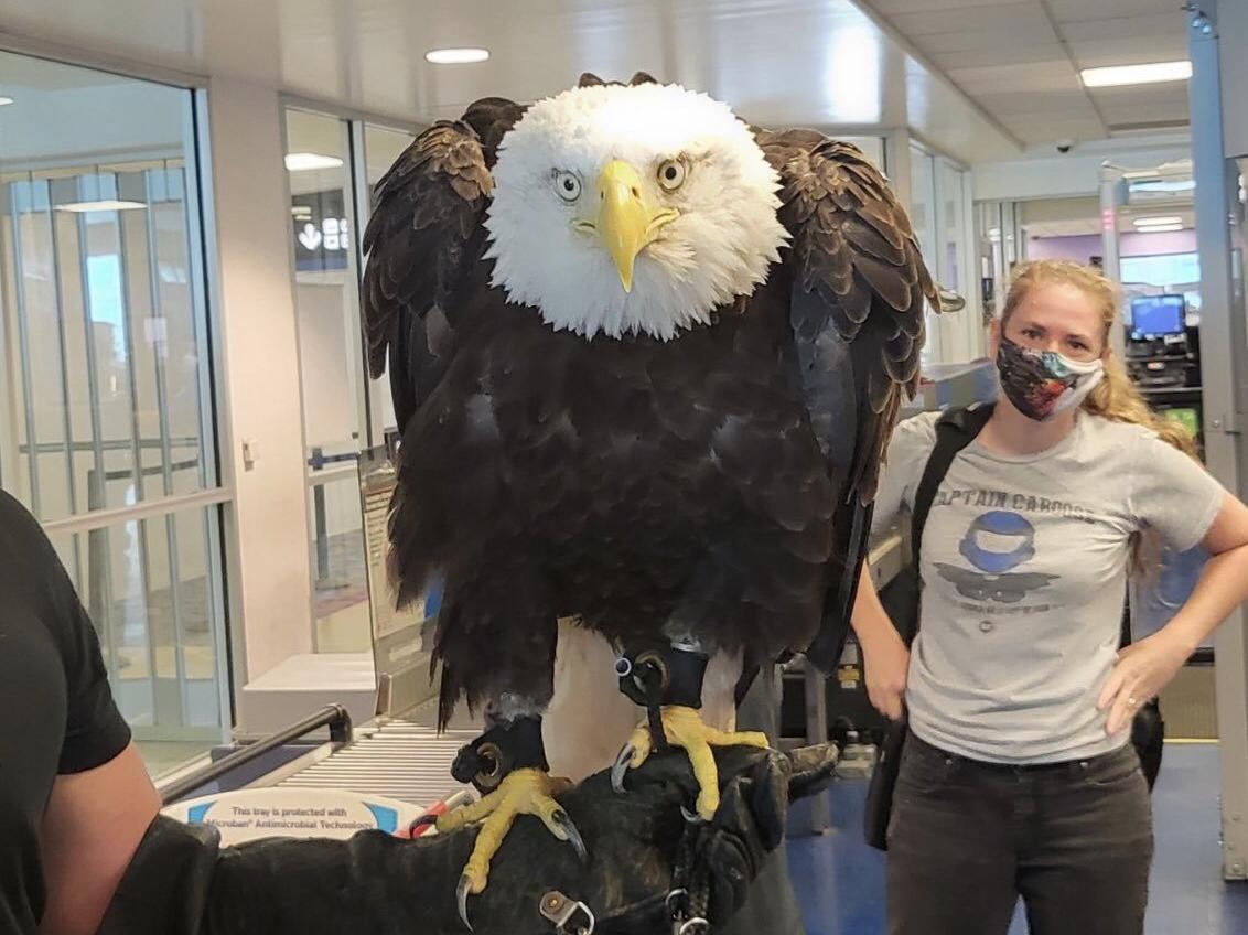 ABD’de güvenlik taraması sırasında, bakıcısıyla seyahat eden dev kel kartal görenleri korkuttu.