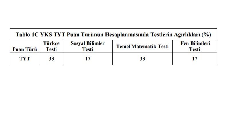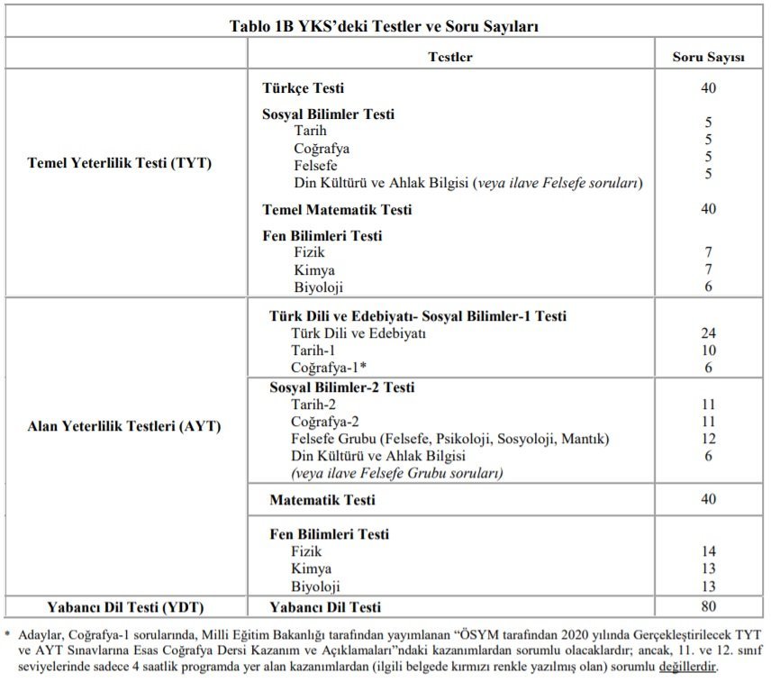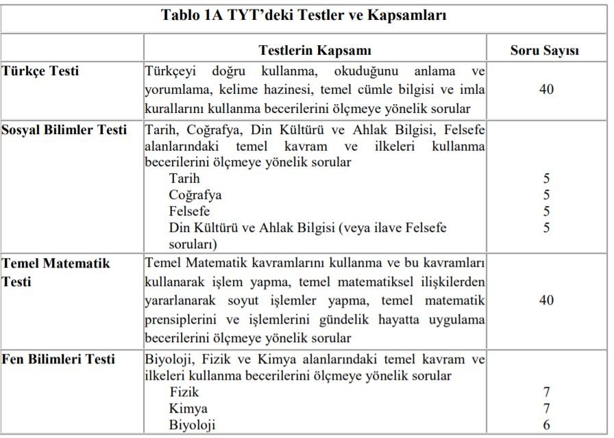TYT’de; Türkçe Testi, Sosyal Bilimler Testi, Temel Matematik Testi ve Fen Bilimleri Testi yer alacaktır. TYT’de uygulanacak testler ve kapsamları, Tablo 1A’da gösterilmiştir. AYT’de adaylara, Türk Dili ve Edebiyatı-Sosyal Bilimler-1, Sosyal Bilimler-2, Matematik ile Fen Bilimleri testlerinden