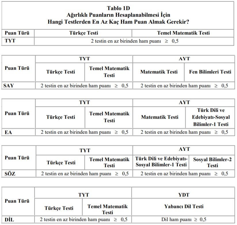 SAY, SÖZ, EA ve DİL puan türleri ile öğrenci alan yükseköğretim programlarına girmek isteyen adayların, TYT’ye ek olarak 2020-AYT ve/veya 2020-YDT’ye de girmeleri ve tercih edecekleri yükseköğretim programları için gerekli olan testleri cevaplamaları zorunludur. Yükseköğretim programlarının puan türleri, Tablo 4’te verilmiştir. Bu programların puan türlerinin hesaplanmasında hangi testlerin kullanılacağı Tablo 1E’de gösterilmiştir. Adaylar, Tablo 1E’yi inceleyerek hangi testleri cevaplamaları gerektiğini belirleyebileceklerdir.