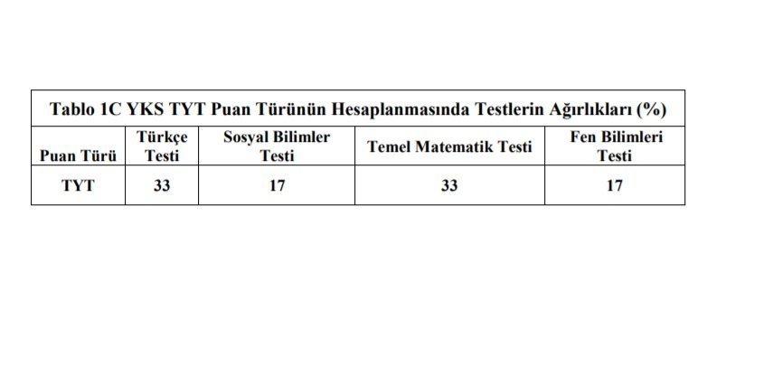 TYT'de; Türkçe Testi, Sosyal Bilimler Testi, Temel Matematik Testi ve Fen Bilimleri Testi yer alacaktır. TYT'de uygulanacak testler ve kapsamları, Tablo 1A'da gösterilmiştir. AYT'de adaylara, Türk Dili ve Edebiyatı-Sosyal Bilimler-1, Sosyal Bilimler-2, Matematik ile Fen Bilimleri testlerinden
