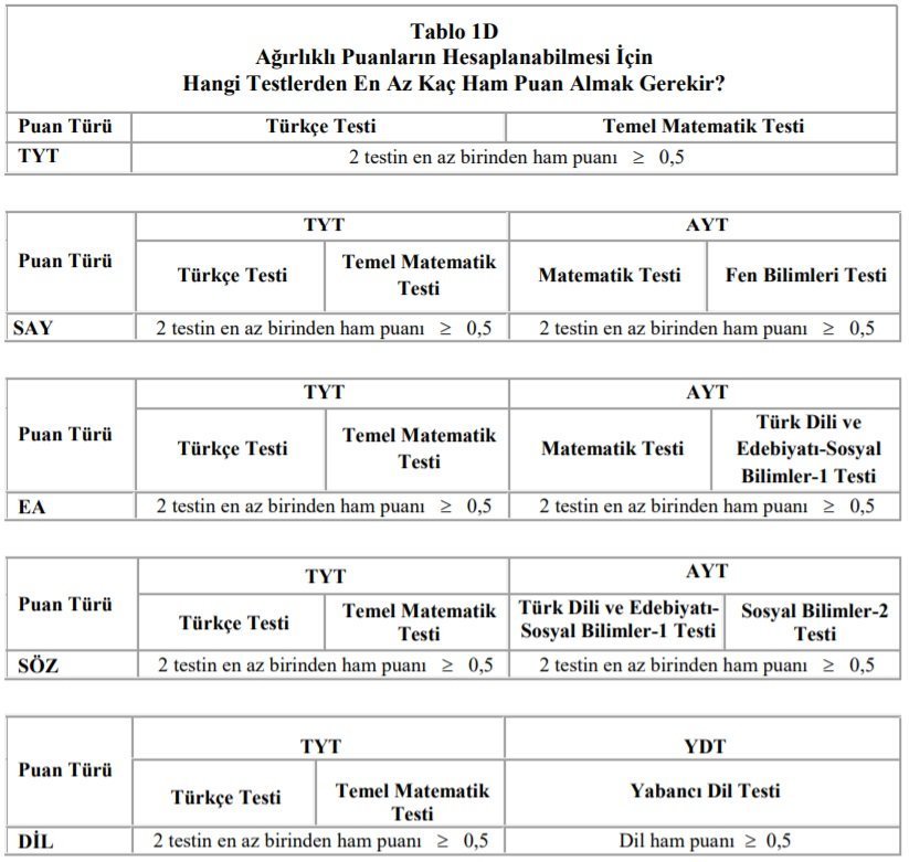 SAY, SÖZ, EA ve DİL puan türleri ile öğrenci alan yükseköğretim programlarına girmek isteyen adayların, TYT'ye ek olarak 2020-AYT ve/veya 2020-YDT'ye de girmeleri ve tercih edecekleri yükseköğretim programları için gerekli olan testleri cevaplamaları zorunludur. Yükseköğretim programlarının puan türleri, Tablo 4'te verilmiştir. Bu programların puan türlerinin hesaplanmasında hangi testlerin kullanılacağı Tablo 1E'de gösterilmiştir. Adaylar, Tablo 1E'yi inceleyerek hangi testleri cevaplamaları gerektiğini belirleyebileceklerdir.