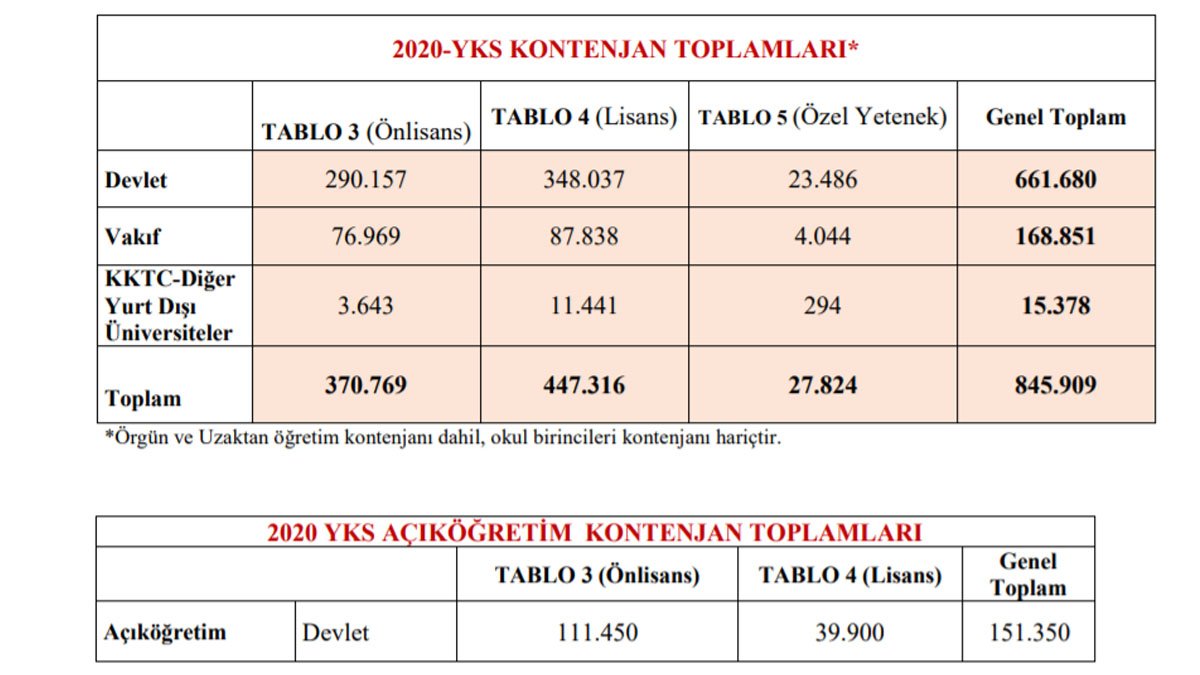 Devlet üniversitelerinde okul birincisi kontenjanları hariç 282 bin 402 ön lisans, 345 bin 997 lisans, 23 bin 486 özel yetenek olmak üzere toplam 651 bin 885 kontenjan ayrıldı. Vakıf yükseköğretim kurumlarında 76 bin 268 ön lisans, 87 bin 838 lisans, 4 bin 44 özel yetenek olmak üzere toplam 168 bin 150, KKTC ve diğer üniversitelerde 3 bin 643 ön lisans, 11 bin 211 lisans, 294 özel yetenek olmak üzere toplam 15 bin 148 kontenjan verildi.