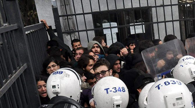 Ancak bir süre sonra Fen Fakültesi'nin öğrencilerinin çıkış yaptığı demir kapı kapatıldı. Polis, öğrencileri demir kapı önünde çevreleyerek müdahale etti. Biber gazı sıkılarak gözaltına alınan öğrenciler polis minibüslerine taşındı. Bazı öğrenciler yerlerde sürüklendi. Polis ile görüntü almaya çalışan basın mensupları arasında da zaman zaman itiş kakış yaşandı. 23 kişiyi gözaltına alan polis, daha sonra fakülteye de girdi. Sivil polisler bir süre üniversite içinde kaçan öğrencileri aradı.