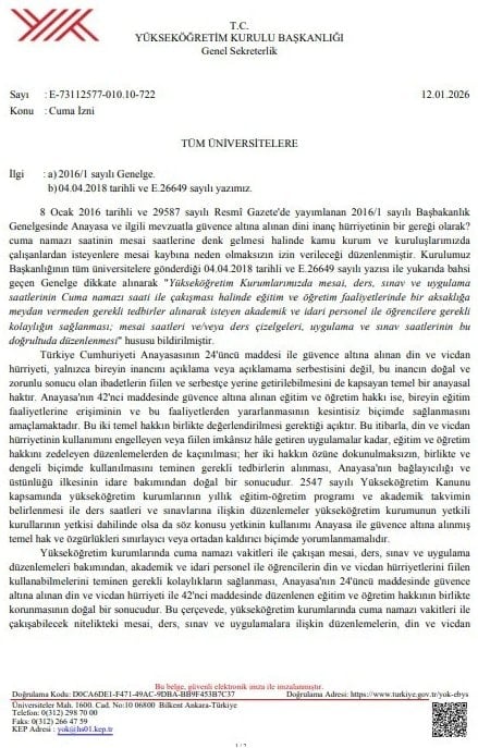 Yükseköğretim Kurulu (YÖK) imzasıyla tüm üniversitelere iletilen yazıda, cuma namazı saatleriyle akademik faaliyetlerin çakışması halinde gerekli tedbirlerin alınması gerektiği belirtildi.