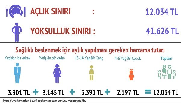 Buna göre, dört kişilik bir ailenin aylık mutfak harcamasını oluşturan açlık sınırı ağustosta 12 bin 34 TL; kira, fatura, ulaşım, eğitim, sağlık, giyim gibi aylık tüm harcamalarını kapsayan yoksulluk sınırı ise 41 bin 626 TL'ye yükseldi.