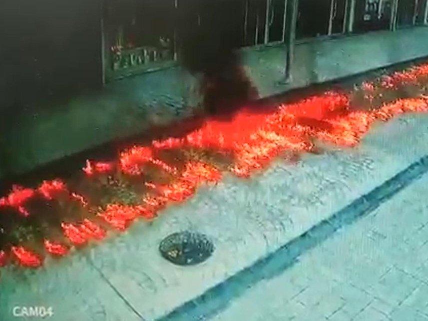 Bir anda caddeyi alevler kapladı. O anlar güvenlik kamerasına yansırken, çevredekiler bölgeden uzaklaştı. İhbar üzerine adrese sevk edilen ekipler, alevlere müdahale ederek kısa sürede söndürdü. (DHA)