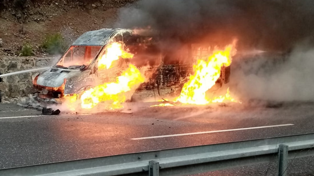 Muğla’nın Ortaca ilçesinden Köyceğiz ilçesine itmekte olan yolcu minibüsü Kocabel Mevkii’nde motor bölümünden yanmaya başladı. Alev alev yanan minibüsü yol kenarına çeken şoför yolcuları indirip olay yerinden uzaklaştırdı.