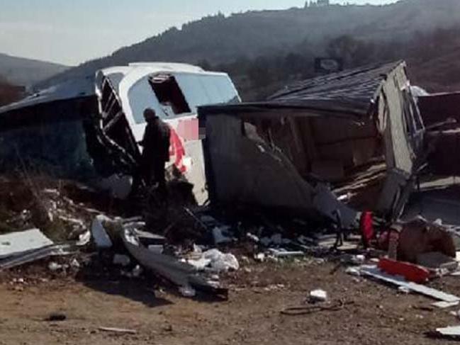 FOTO: İHA- BALIKESİR-BURSA KARAYOLUNDA MEYDANA GELEN TRAFİK KAZASINDA YOLCU OTOBÜSÜ İLE TIR ÇARPIŞTI. KAZADA OTOBÜSTE BULUNAN 18 YOLCU YARALANDI.Yolcu otobüsü ile kamyon çarpıştı: Çok sayıda yaralı var