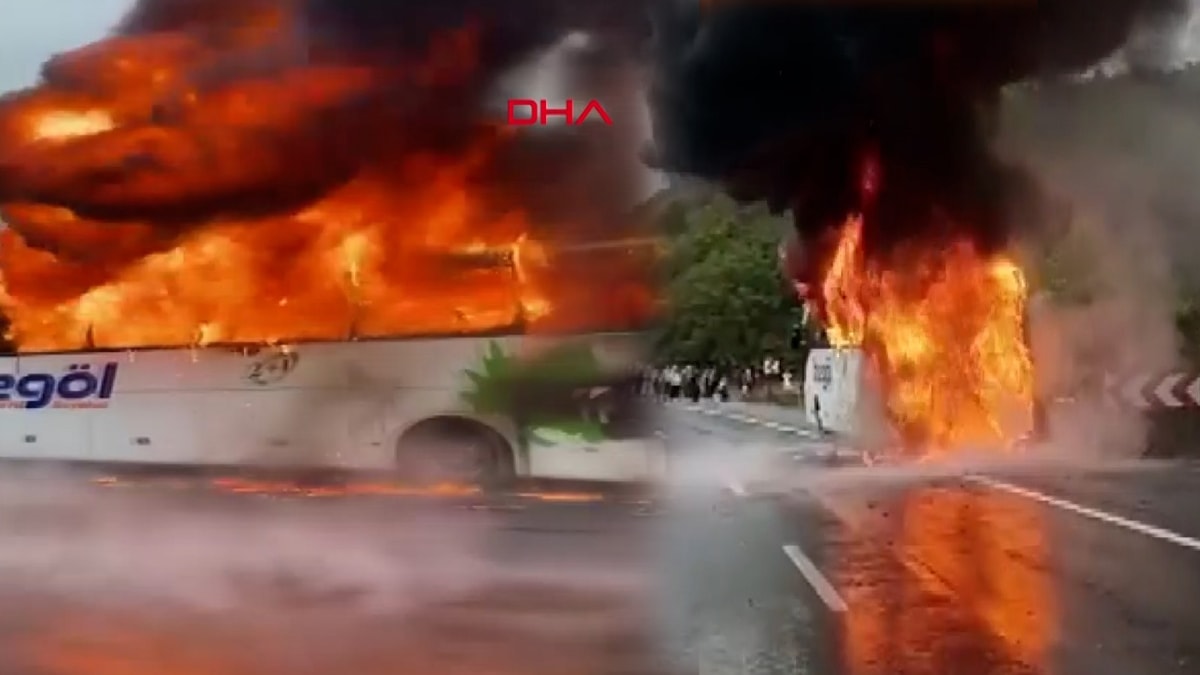 Sürücü yol kenarına çektiği otobüsteki yolcuları tahliye ederken, otobüs alev alev yandı. İhbarla olay yerine sevk edilen itfaiye ekiplerince yangın söndürülürken, otobüs kullanılamaz hale geldi.