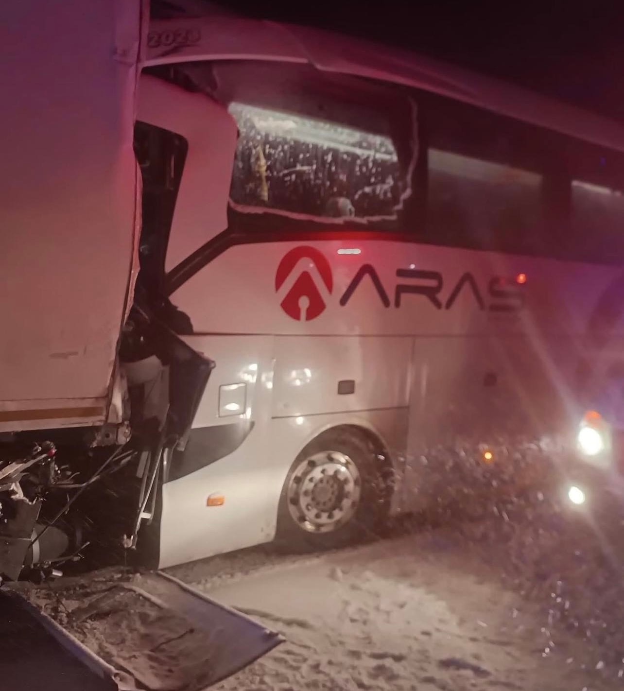 Sivas’ın Gölova ilçesi Çobanlı mevkisinde meydana gelen kazada, Iğdır’dan İstanbul’a gitmekte olan V.A. yönetimindeki 34 ARS 576 plakalı Aras firmasına ait yolcu otobüsü, park halinde bulunan 41 ABN 013 plakalı TIR’a arkadan çarptı.