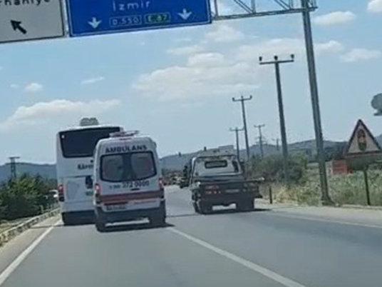 Edinilen bilgiye göre, Edremit'ten Ayvalık karayolu istikametine seyreden yolcu otobüsü, arkasından siren çalarak gelip yol isteyen ambulansa duyarsız kaldı.
