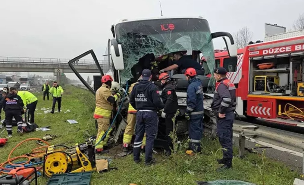 Düzce'de gerçekleşen kaza, saat 13.30 sıralarında Anadolu Otoyolu’nun Düzce Türsan Tesisleri mevkiinde meydana geldi. Ankara istikametine giden Efe Tur firmasına ait sürücüsünün ismi öğrenilemeyen 41 FM 831 plakalı yolcu otobüsü, sürücüsünün direksiyon kontrolünü kaybetmesi nedeniyle yol kenarındaki bariyerlere çarptı. Kazayı görenlerin ihbarı üzerine olay yerine acil sağlık, AFAD, itfaiye ve polis ekipleri sevk edildi.