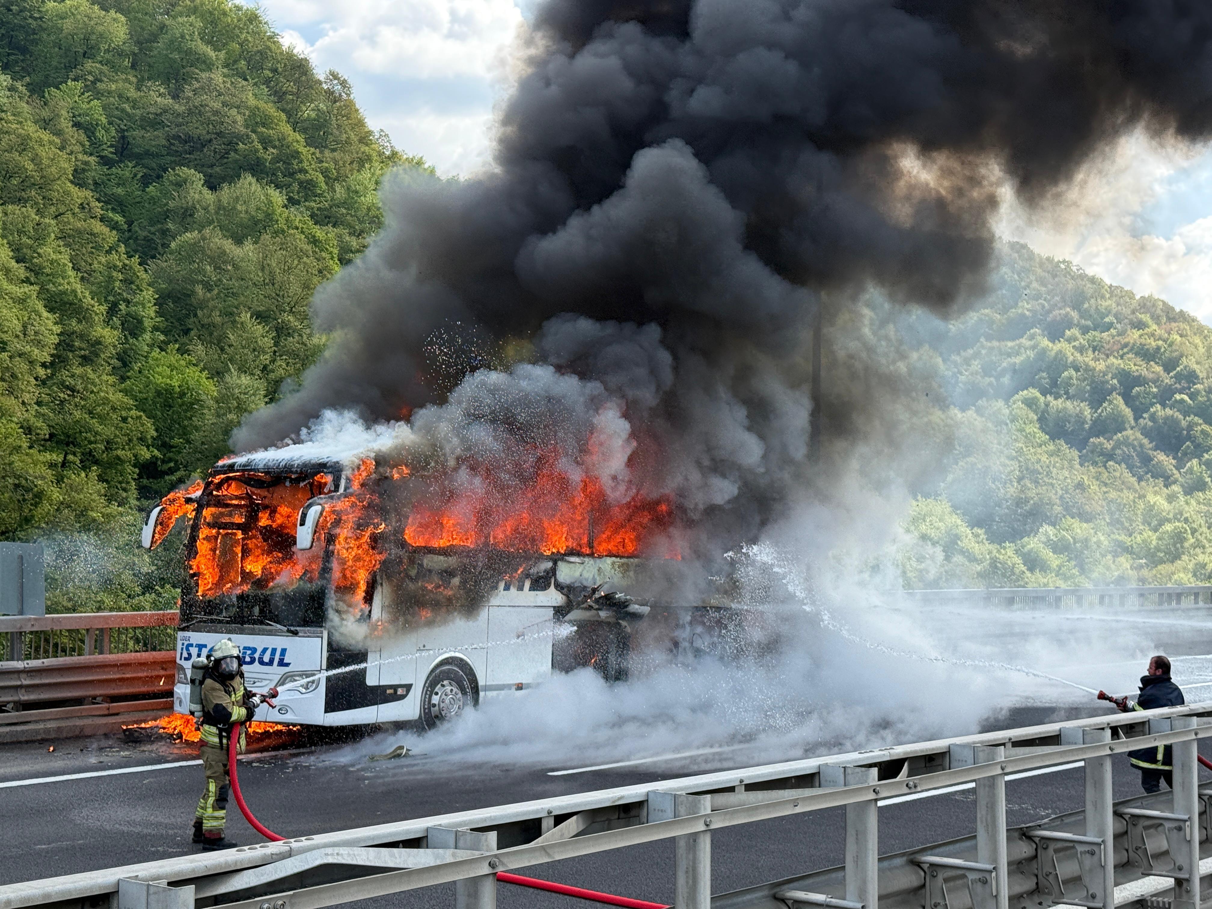 Hatay’dan İstanbul’a gitmekte olan yolcu otobüsünün motor bölümünde henüz bilinmeyen bir nedenle yangın çıktı. Dumanları fark eden otobüs şoförü aracı sağ şeride çekerek yolcuları tahliye etti.