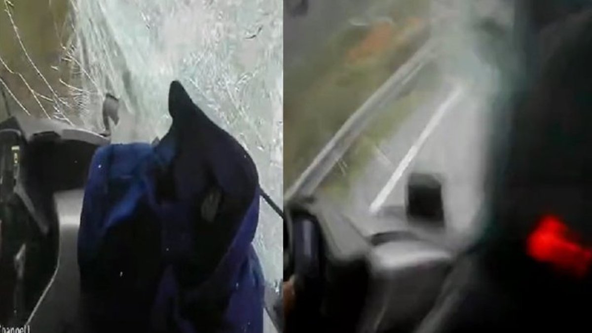Bursa'da, yol yapım çalışmaları nedeniyle dubalarla ayrılan otoyolda aniden şerit değiştiren hafriyat kamyonu ile çarpışan bir Kamil Koç firmasına ait şehirlerarası yolcu otobüsünün kaza anı, araç içi kamerasına yansıdı. Kaza sonucu otobüsteki 3 yolcu hafif yaralandı. Olayla ilgili soruşturma başlatıldı. (DHA)