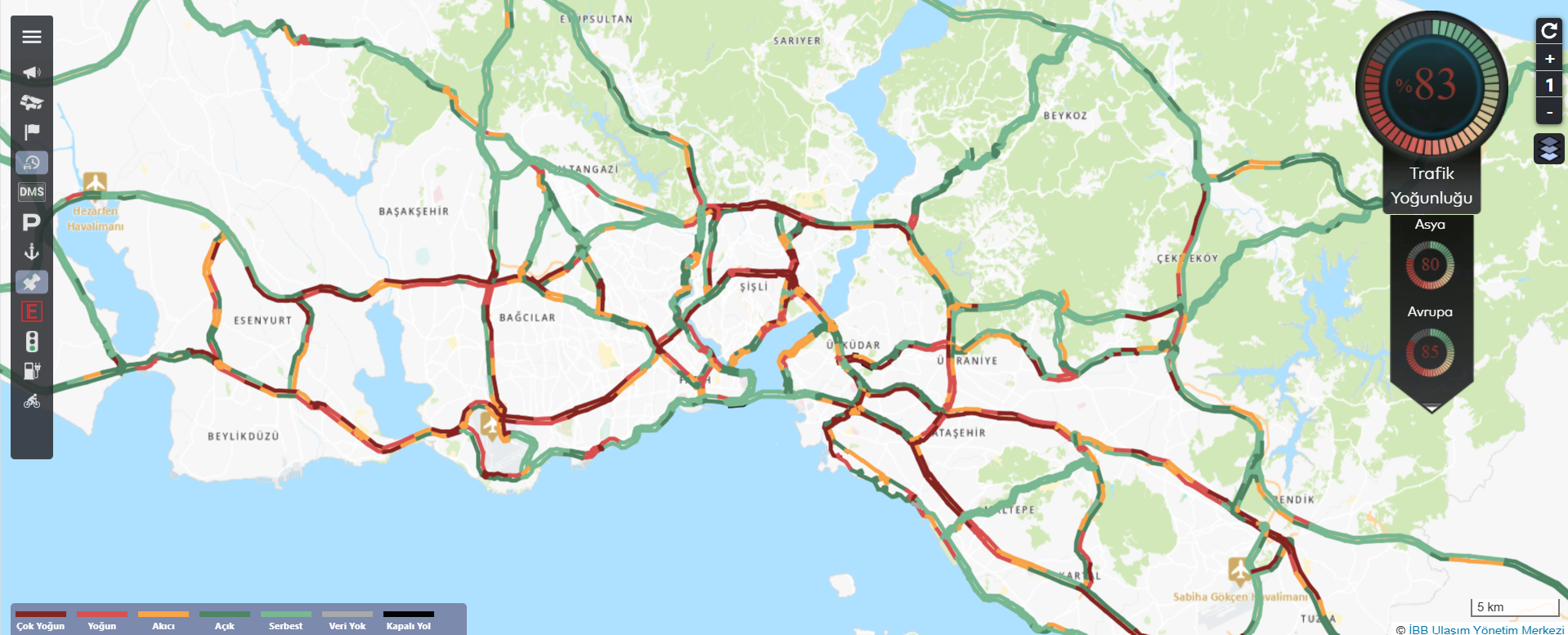 İBB trafik yoğunluğu haritasına göre yoğunluk, saat 18:15 itibarıyla yüzde 83'ü buldu. Anadolu Yakası'nda yoğunluk yüzde 80'de kalırken Avrupa Yakası'nda yoğunluk yüzde 87'yi buldu.