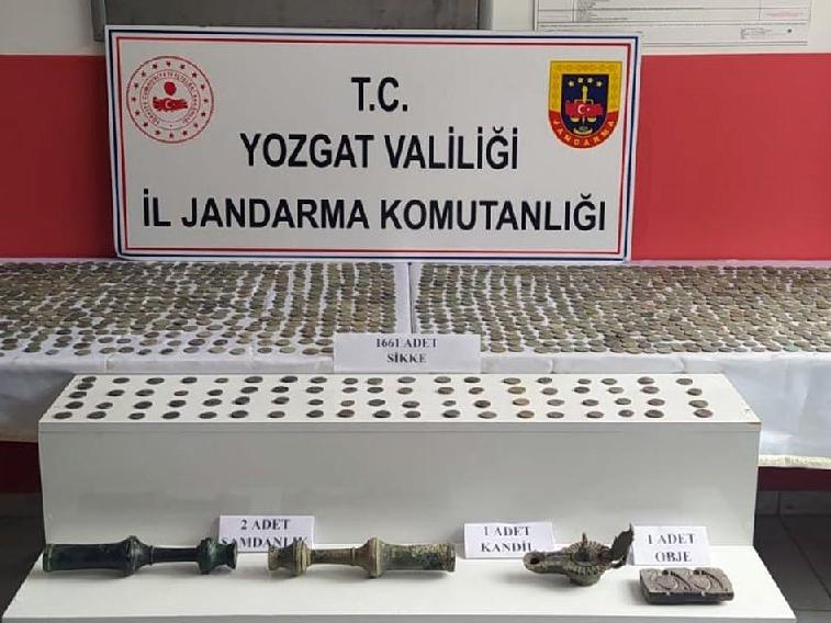 Yozgat'ta jandarma ekipleri tarafından durdurulan 2 otomobilde çeşitli dönemlere ait bin 665 adet tarihi eser ele geçirildi. Olayla ilgili 7 kişi gözaltına alındı.