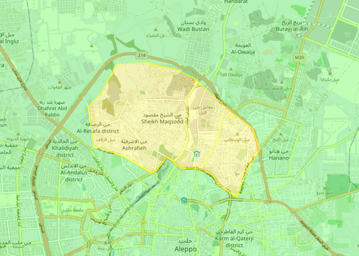 Sarı: SDG mevzileri - Şeyh Mahsud ve Eşrefiye / Yeşil: Suriye Güvenlik Güçleri - Halep