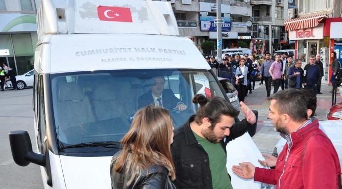 CHP Gençlik Kolları üyesi bir grup, eylemin henüz başında, Şehzadeler İlçe Başkanı Semih Balaban'ın kullandığı, partiye ait minibüsün önünü keserek alana girmesini engelledi. Partililerin araya girmesine rağmen ısrarını sürdüren gençleri, eylem için alanda bulunan polisler ikna etti. Seçim minibüsü alana girdi.