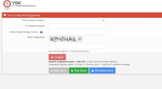 Seçmen sorgulama sistemine aşağıdaki bağlantıdan erişebilirsiniz. YSK'nın bu sayfasında TC kimlik numaranız ve nüfus cüzdanınızın arka tarafında yazan nüfüsa kayıt sıranızı ve ekrandaki güvenlik kodunuzu girerek seçmen kütüğününde kaydınız olup olmadığını sorgulayabilirsiniz.
