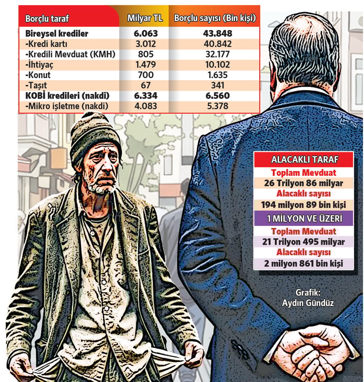 Toplam 194 milyon adet banka hesabı var. Bu hesapların 175 milyonu 10 bin liranın altındaki paralardan oluşuyor, toplam varlığı ise sadece 141 milyar lira. Yaklaşık 28 milyon hesapta 10 bin ile 250 bin, 5.2 milyon hesapta da 250 bin ile 1 milyon lira arasında para var. Bunların toplam varlığı da 4.4 trilyon. Ülkenin bir yüzü ise yoklukla boğuşuyor. Yaklaşık 44 milyon kişi 6 trilyonu aşkın bireysel kredi ve kredi kartı borcuyla hayatını döndürmeye çalışıyor. 10.1 milyon kişi kullandığı ihtiyaç kredisi, 1.6 milyon kişi konut kredisi, 341 bin kişi de taşıt kredisi borcunu ödemek için her ay büyük mücadele veriyor.