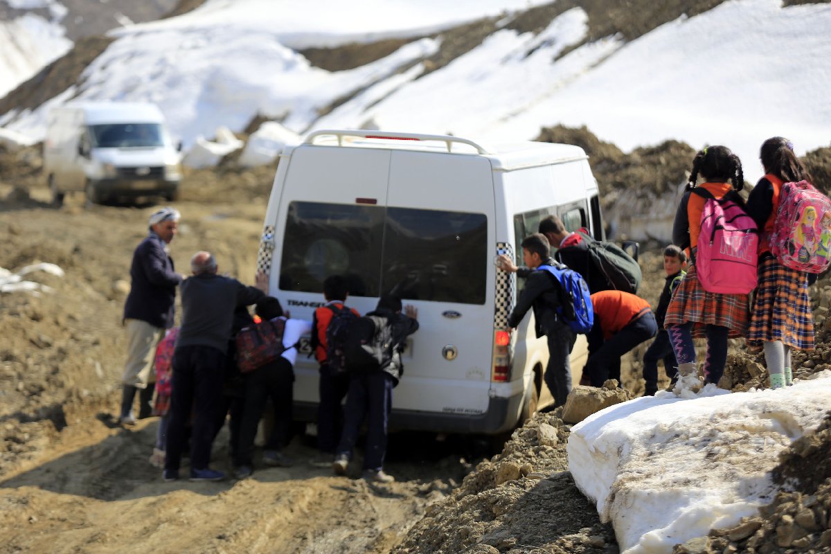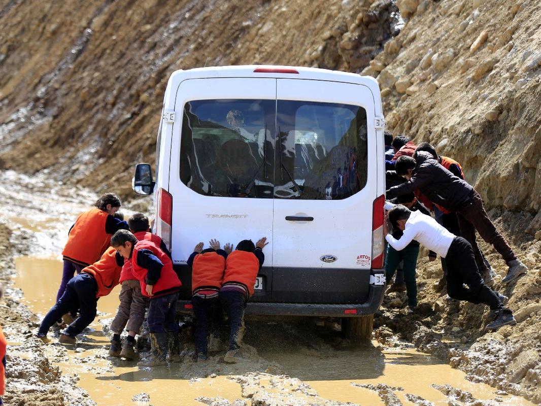 Öğrenciler, yer yer dizlerine kadar ulaşan çamurun içerisine girip, servis araçlarını itiyor.