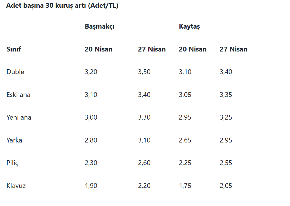 Türkiye’nin önemli yumurta üretim merkezlerinden Afyon ve Kayseri’de toptan yumurta fiyatları adet başına tüm ürünlerde 30 kuruş arttı. Arz fazlası ve “Mayıs Çukuru” olarak bilinen düşük tüketim döneminin negatif etkisini erken atlattı.