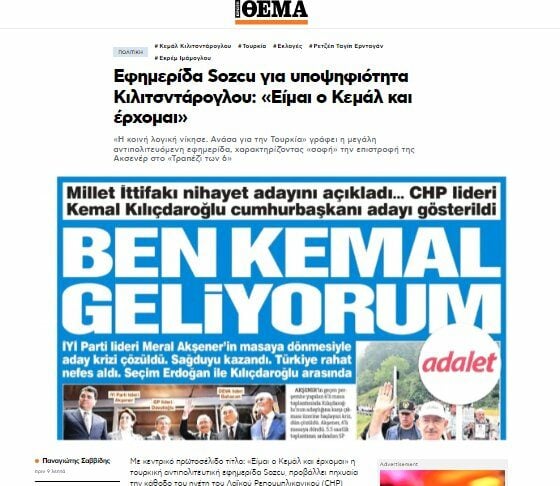 SÖZCÜ Gazetesi’nin bugün yayınladığı Ben Kemal Geliyorum manşetli nüshası Yunanistan’ın önde gelen gazetelerinde manşet oldu.